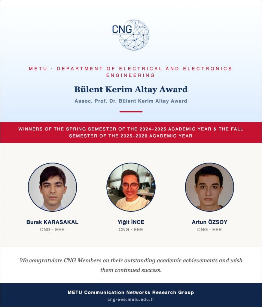 We are proud to see METU Research Group on Communication Networks members; Burak Karasakal, Yiğit İnce, and Artun Özsoy recognized among the awardees for the Spring Semester of the 2024–2025 Academic Year and the Fall Semester of the 2025–2026 Academic Year. We sincerely congratulate them on this well-deserved achievement and wish them continued success in their academic and professional journeys.