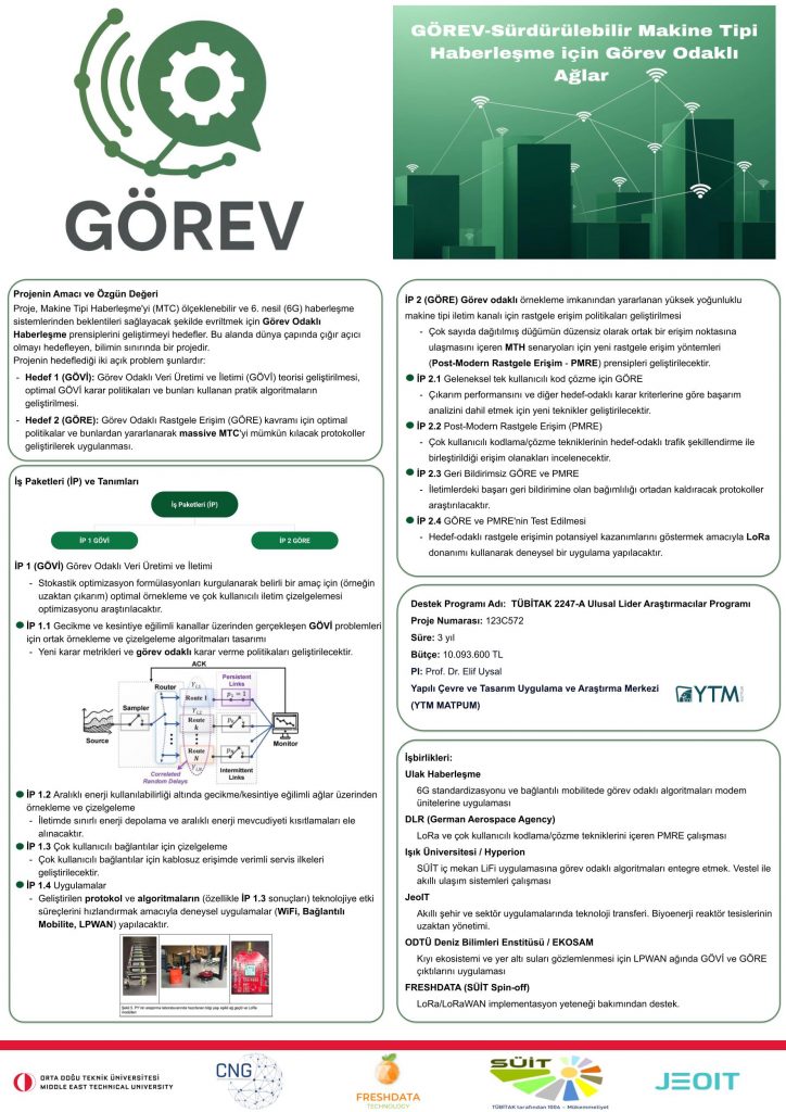 GÖREV is a research project focused on developing sustainable, scalable, and task-oriented communication methods for Machine-Type Communications and future 6G networks. The project aims to move beyond conventional data-centric networking by designing algorithms and protocols that prioritize the usefulness, timeliness, and task relevance of transmitted information.